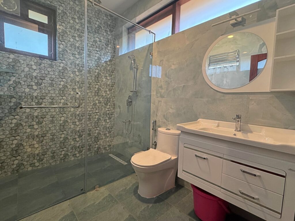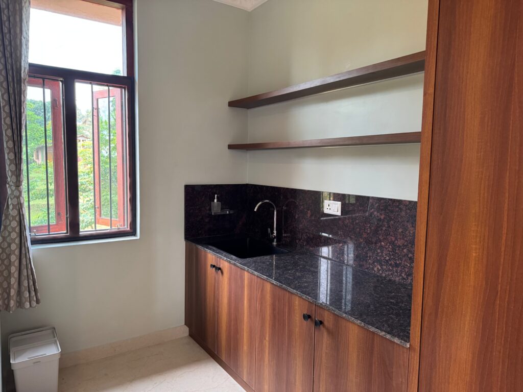 Spacious twin-share rooms with two twin-size beds, large wardrobe, desk, kitchenette, attached private bathroom, and private terrace overlooking beautiful nature.